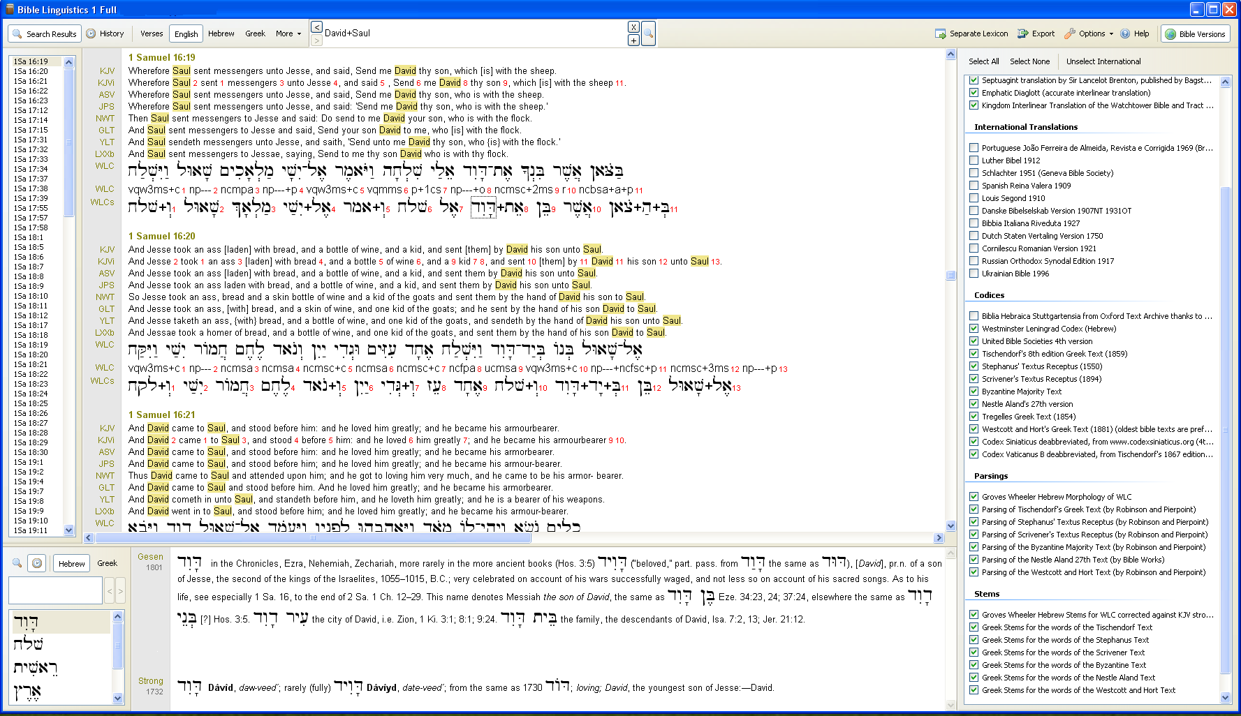 Below is a search for the two English words David and Saul. The verses containing both of these words (not necessarily one after the other but merely both in the same verse) are listed in the Bible Search Results Window. The Lexicon window has a search for the Hebrew word @p;a' Awpap, meaning to surround. It also shows the previous Hebrew lexicon search history.