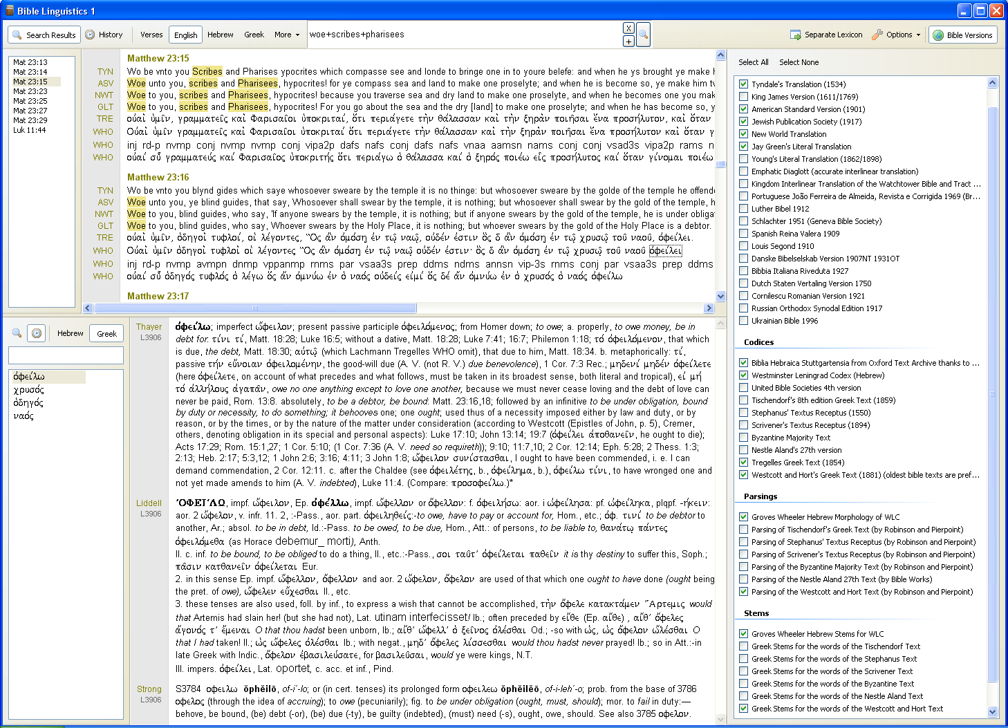 Below is a search for the 3 English words woe, Scribes and Pharisees. The Search Results window has the verses which contain all 3 words. The lexicon window shows the Greek Lexicon search history. It also has the triple lexicon results for the Greek word ovfei,lw.