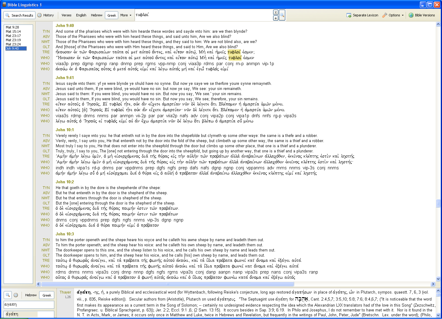 Below is a Greek Bible search for the adjective tufloi, meaning blind (ones). There are 8 bible version chosen and 5 verses are displayed. The lexicon window has a Greek search for the word a,ga,ph which means love, charitable principled love.