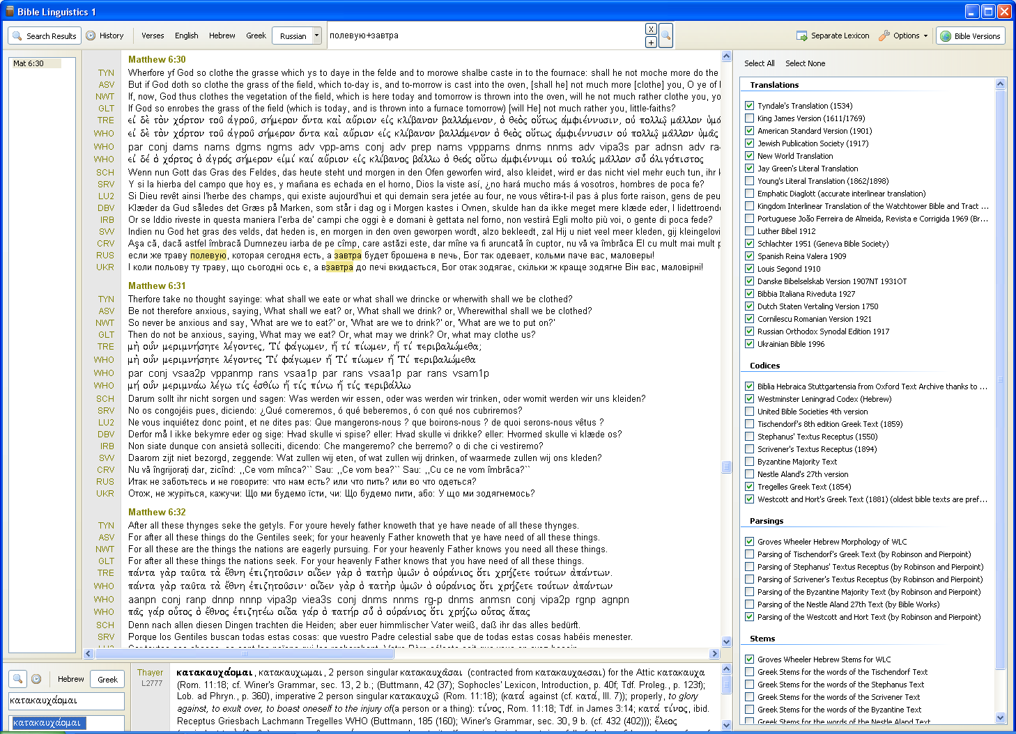 Below is a Russian word search for the two words in the bible search box. They only appear in the same verse in Matthew 6:30. The lexicon search word was the Greek katakauca,omai.